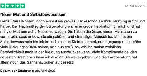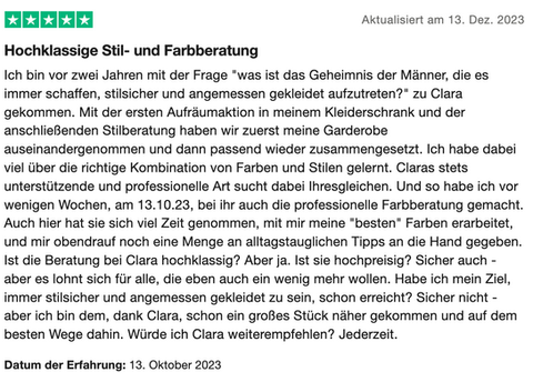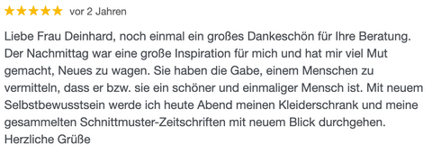 Ergebnis: Anne hat nicht nur mehr Klarheit über passende Farben, Schnitte und Accessoires gewonnen, sondern auch ihren Blick auf sich selbst verändert. Sie fühlt sich heute mutiger, selbstbewusster und deutlich wohler. Mit ihrer neu aufgebauten Garderobe hat sie sich einen lang ersehnten Wunsch erfüllt und ein ganz neues Lebensgefühl entwickelt.