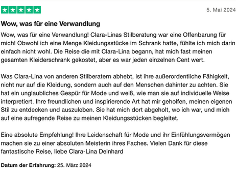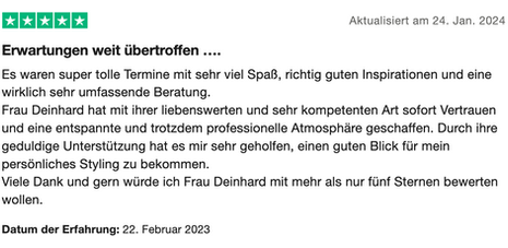 Ergebnis: Anne hat nicht nur mehr Klarheit über passende Farben, Schnitte und Accessoires gewonnen, sondern auch ihren Blick auf sich selbst verändert. Sie fühlt sich heute mutiger, selbstbewusster und deutlich wohler. Mit ihrer neu aufgebauten Garderobe hat sie sich einen lang ersehnten Wunsch erfüllt und ein ganz neues Lebensgefühl entwickelt.