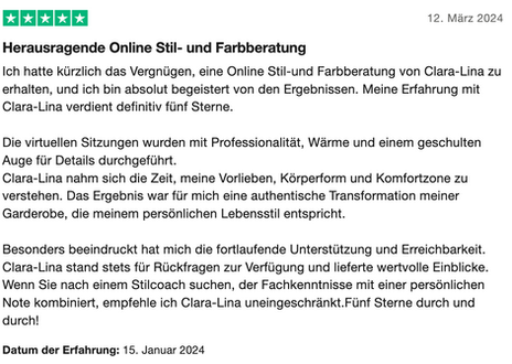 ein klares System für ihre Garderobe entwickelt. Statt Überforderung und Fehlkäufen hat sie heute endlich Klarheit im Stil, mehr Sicherheit und Leichtigkeit im Alltag. Selbst das Packen für Reisen ist mühelos geworden.